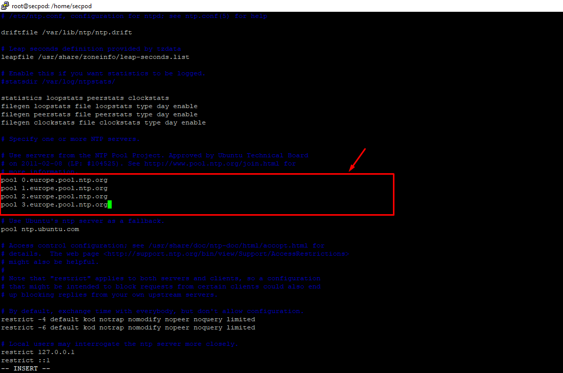 Edit the NTP configuration file /etc/ntp.conf with a text editor:
