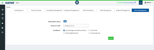 Saner CVEM platform allows administrators to configure alerts for critical events such as device deletion and agent uninstallation. Setting up these alerts helps you stay informed about changes in your device inventory and ensures timely action to maintain compliance and security.