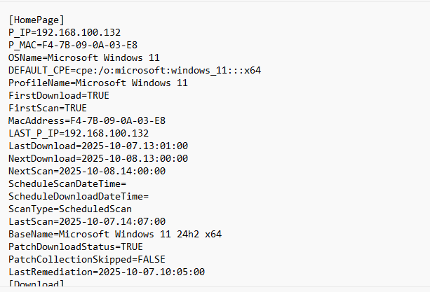 To find details such as last scan time, account ID, MAC address, reboot requirement, secondary server configuration, and other agent information, refer to the status.ini file: