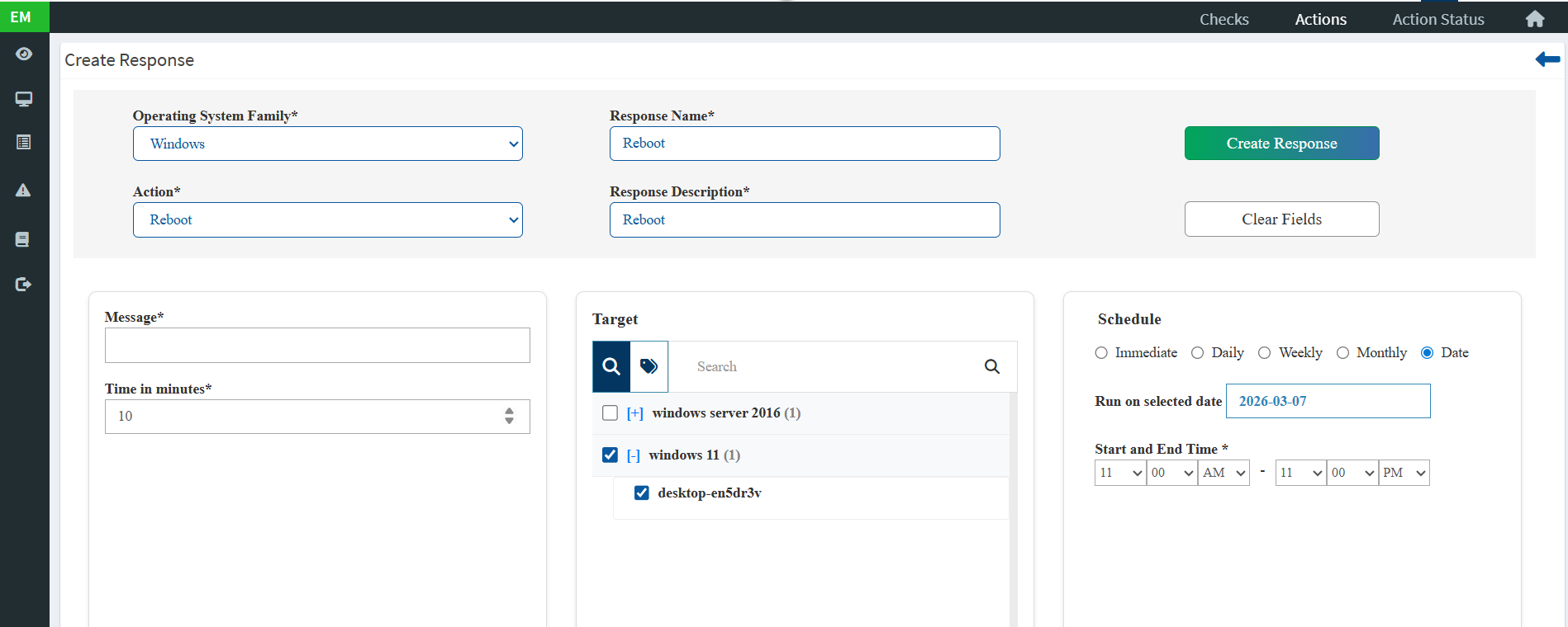 This article explains how to schedule a system reboot automatically at a specific date and time using the Automation module in the EM Console.