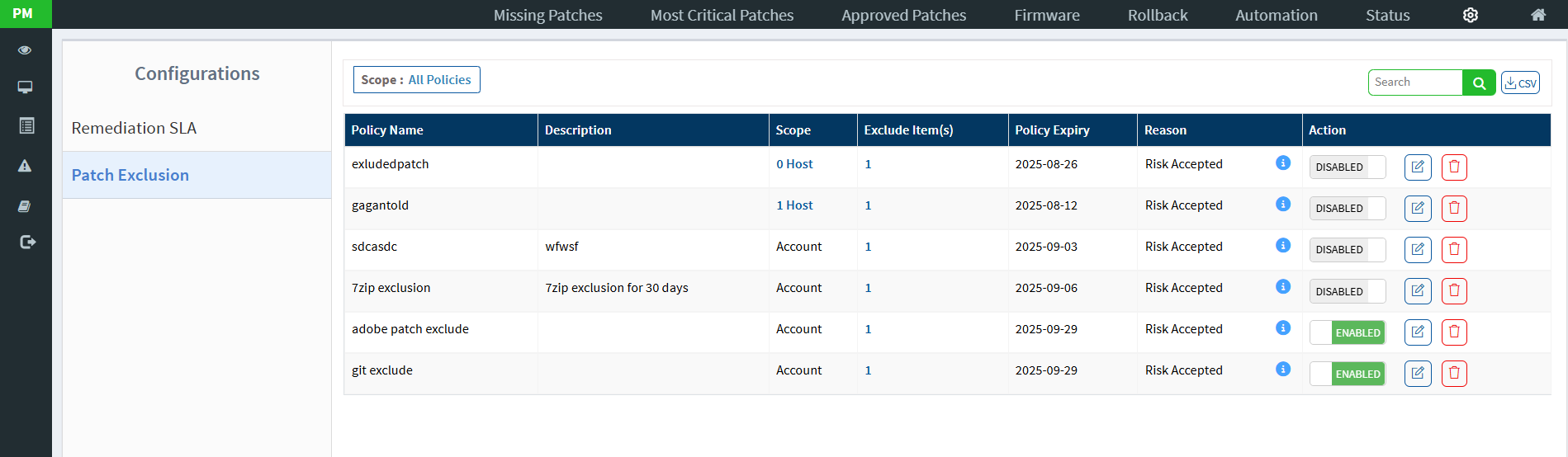 This article explains how to manage existing patch exclusion policies in Saner PM Tool, including enabling, disabling, editing, or deleting them.