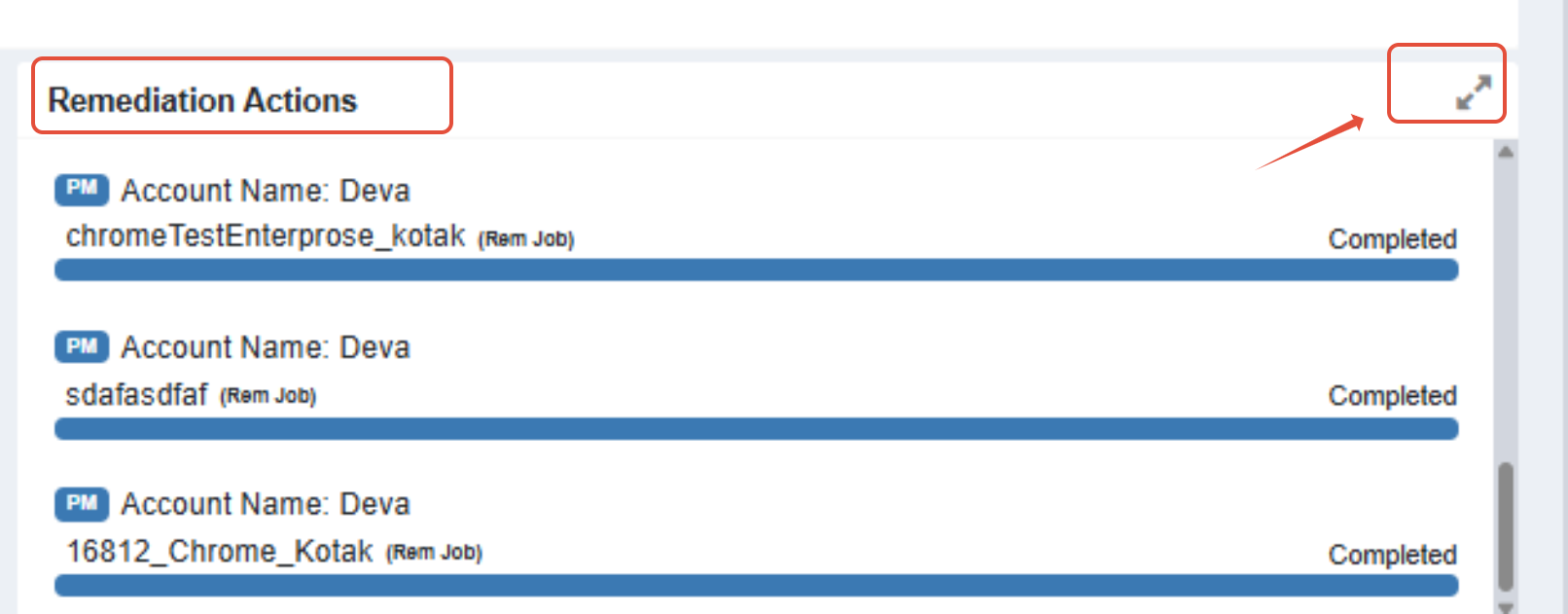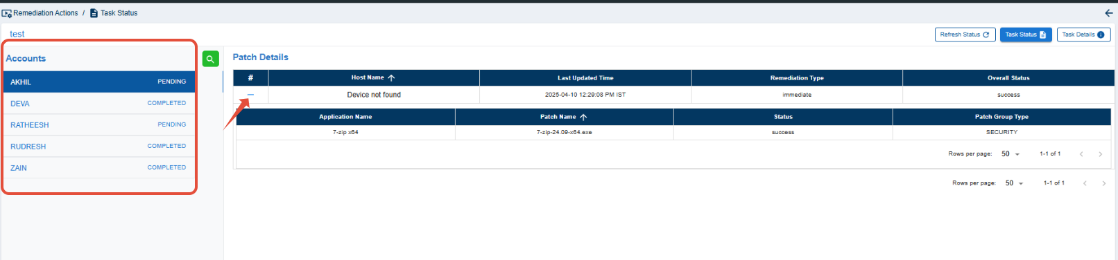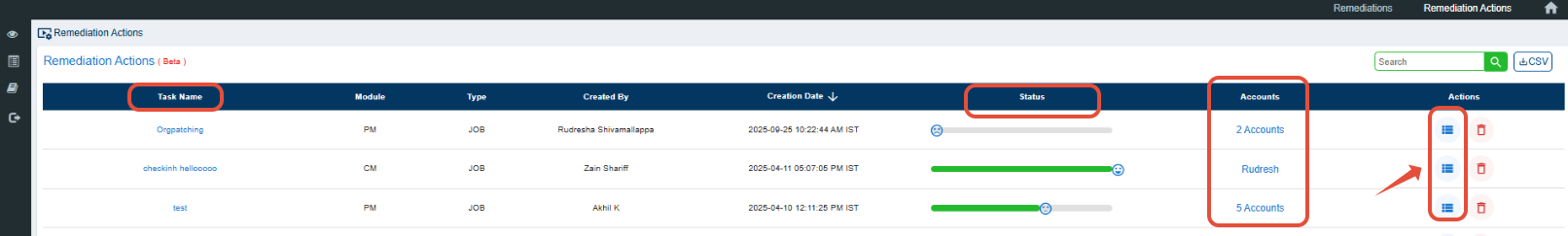 A window will display Task Name, Applied Accounts, and Task Status, where you can click the Task Status icon under the Action column to view account-wise remediation progress.