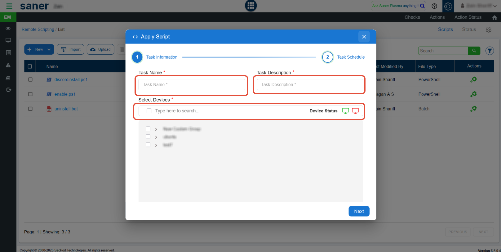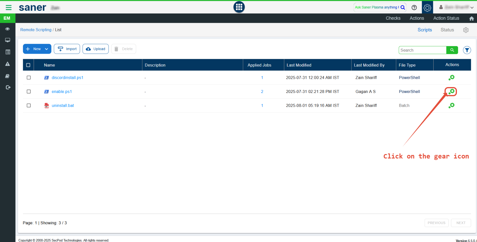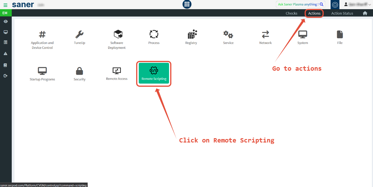 - Navigate to Endpoint Management > Actions > Remote Scripting in the Saner CVEM console.