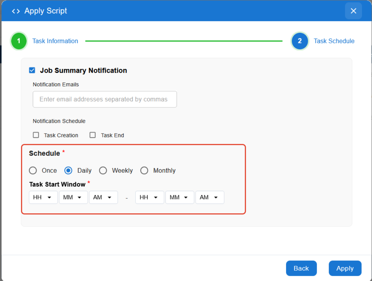 - The Apply Script page will appear.