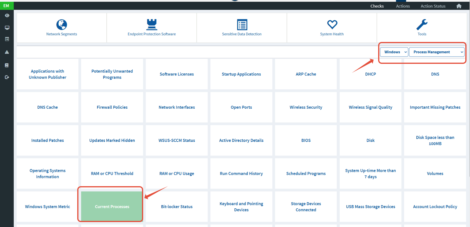 From the filtered options, choose Process Management. This will show all process-related checks for Windows endpoints.