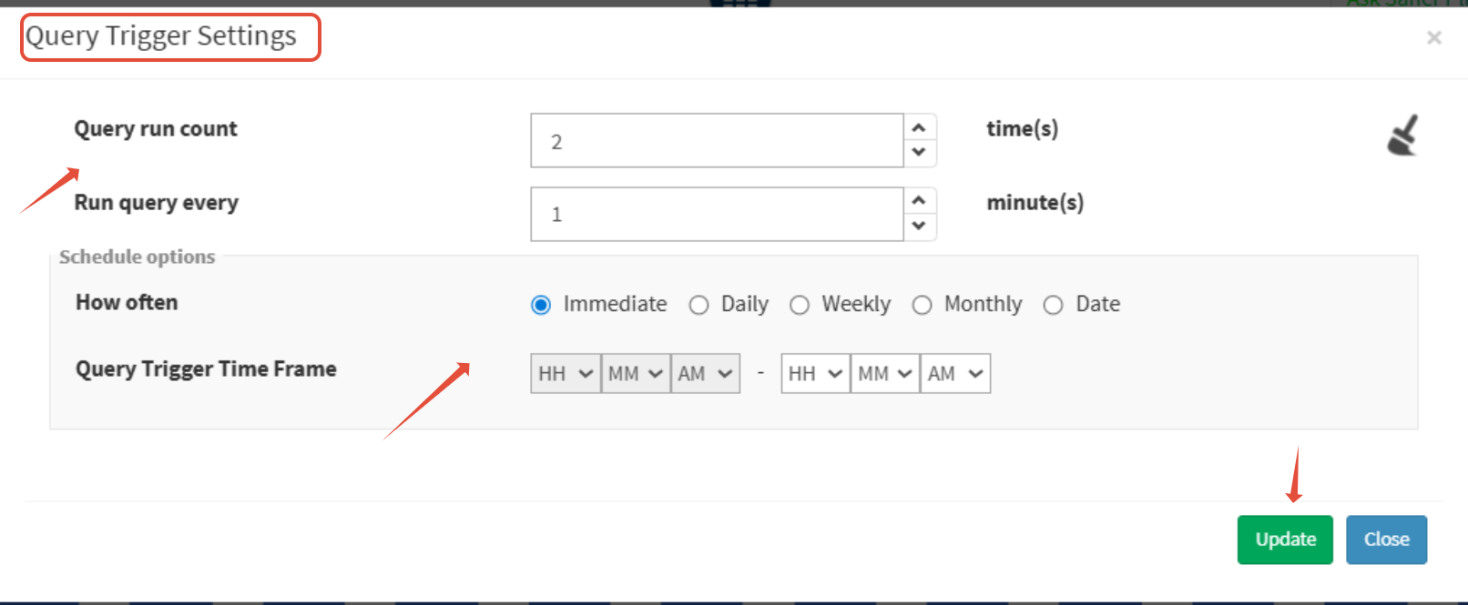 Query Trigger Time Frame: Set the schedule in the Schedule Options pane.
