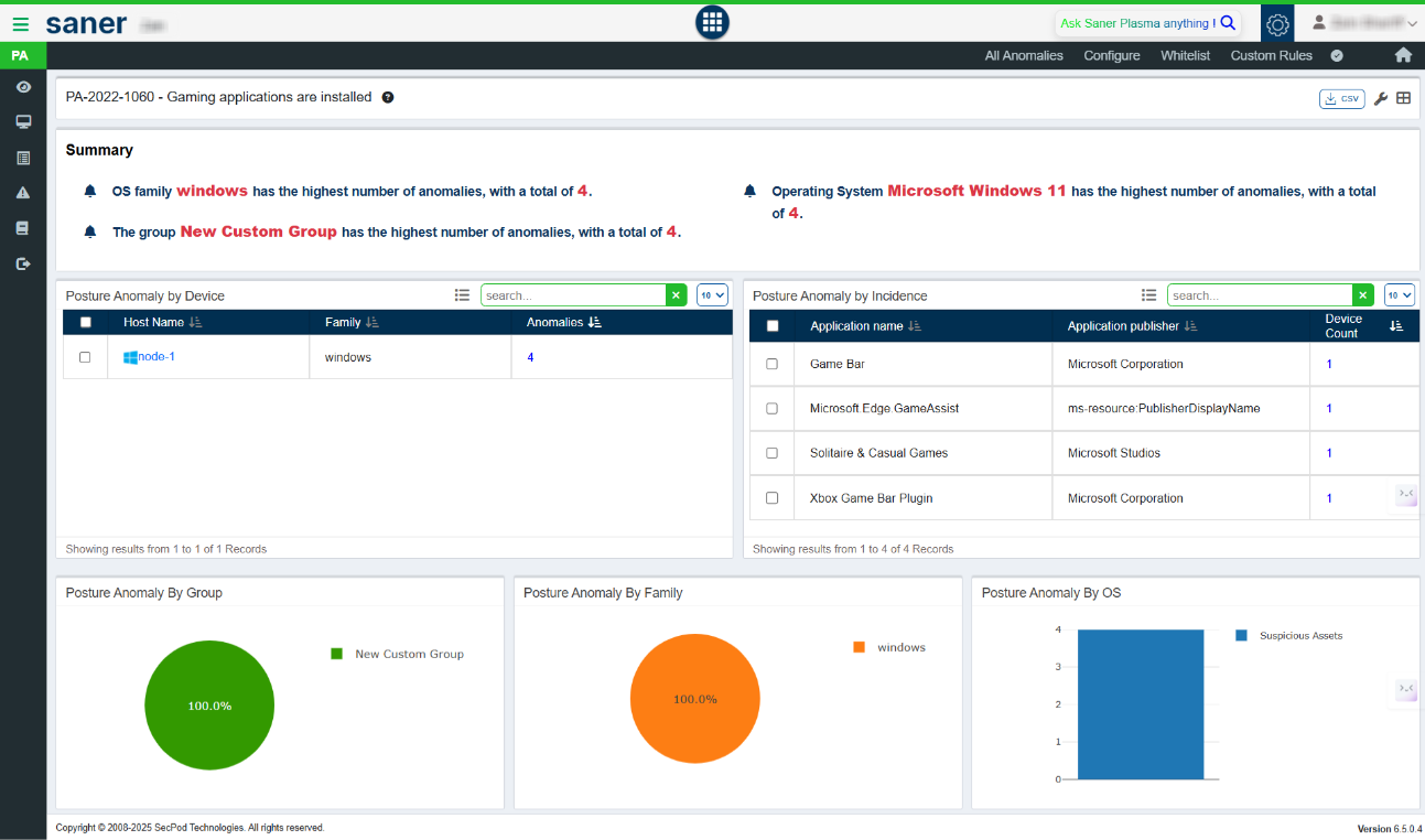 Saner CVEM continuously scans endpoints and raises Posture Anomalies when gaming applications are detected.