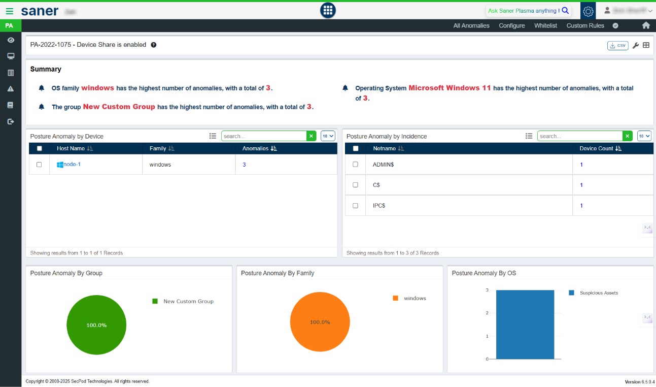 Saner CVEM continuously scans endpoints and generates Posture Anomalies when device sharing is enabled.